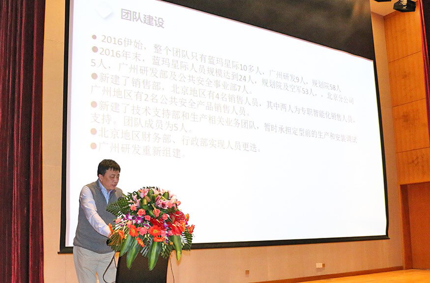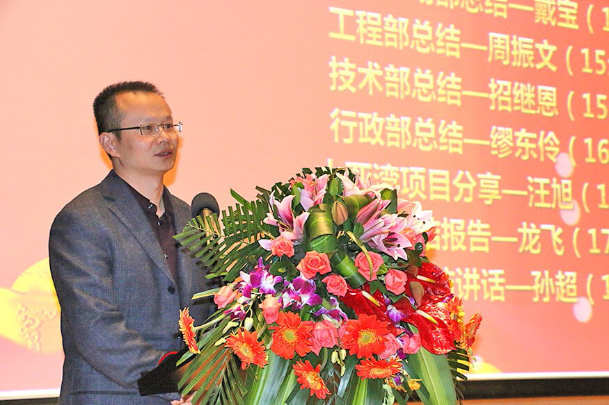 总结大会上,在公司副总裁戴宝先生激情洋溢的开场白后,副总裁钱洪涛先生、今年会智能董事兼蓝玛星际总经理朱勇杰先生、财务总监兼董秘李卓屏女士、副总裁戴宝先生、工程部总监周振文先生、技术部总监招继恩先生、行政部总监缪东伶女士、工程部副总监汪旭先生、总裁龙飞先生先后登台,分别做了2016年度工作总结。