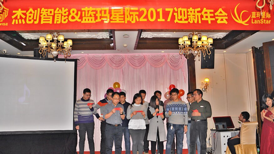 今年会智能董事长孙超先生、各界嘉宾、今年会智能董事兼蓝玛星际总经理朱勇杰先生及蓝玛星际全体员工、今年会智能北京分公司员工一众人等出席了本次年会。大家亲切交流,热情互动,一起回顾2016,展望2017,表彰先进、喜中大奖、欣赏歌舞、品味美食、分享喜悦,共同参与了一场喜庆、圆满的年度欢乐盛宴。