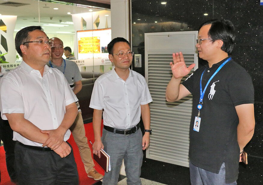 2017年7月24日下午,广州市黄埔区区长陈小华、区政府办公室主任黄建强、区科技局局长夏坚、区政策研究室副主任罗达祥等领导一行莅临我司调研、指导工作,主要了解企业的发展情况以及探讨如何帮助企业获得政策支持。